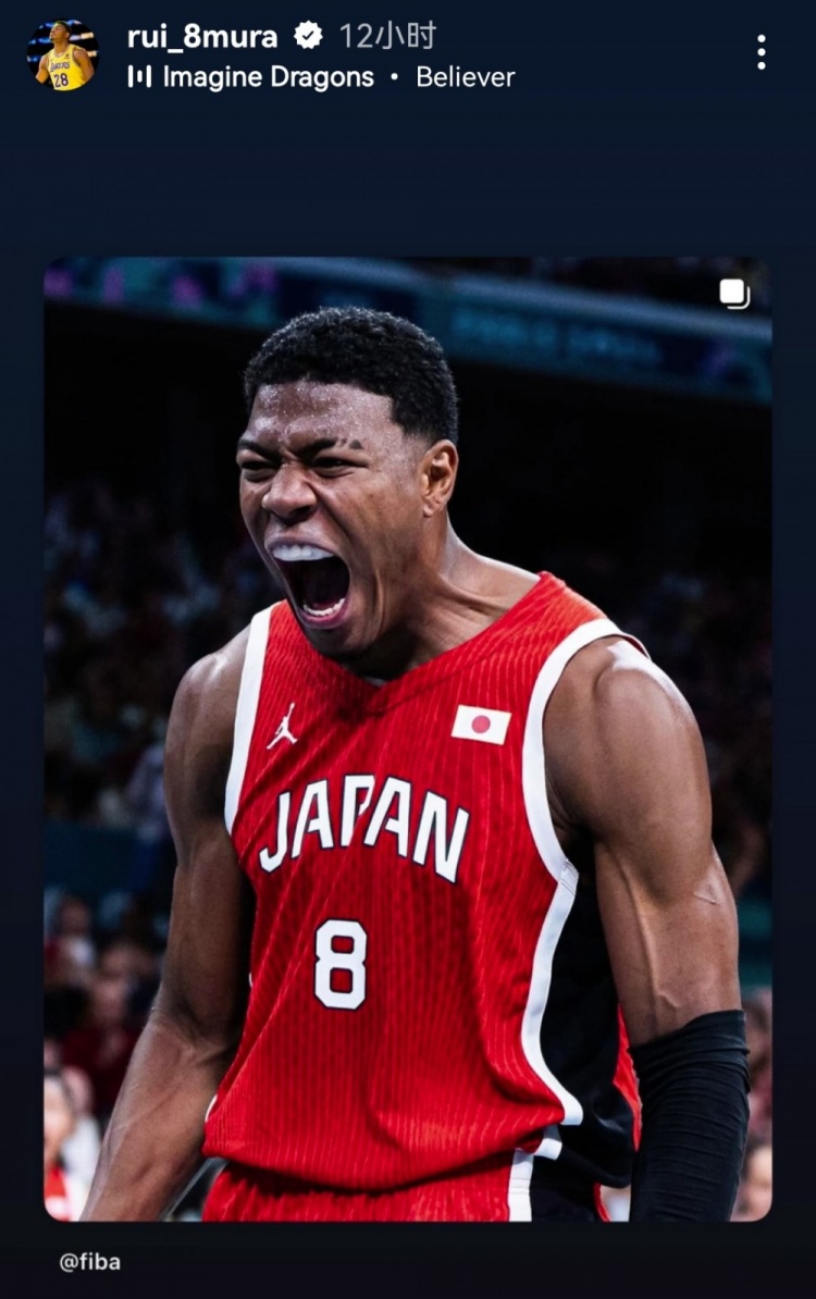 赛后,湖人球星八村塁更新社媒动态,转发了一张自己的国家队怒吼照,背景音乐为梦龙乐队的经典单曲《Believer》(信徒)。