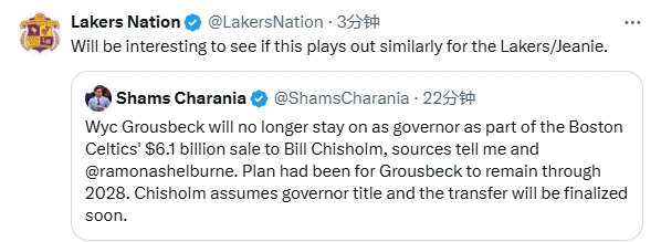 Lakers Nation转发了该新闻,并配文称:“值得关注的是,这种情况是否也会在湖人和珍妮身上重演。”