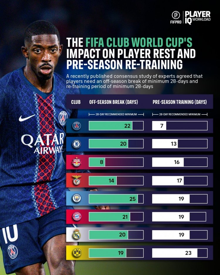 FIFPRO指出,根据相关研究,球员赛季之间的休赛期建议最少28天,而季前训练时间也建议最少28天,但受到世俱杯的影响,球员们根本得不到应有的休息时间。
