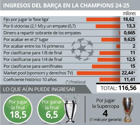 晋级欧冠4强,巴萨将获得1500万欧晋级奖金。市场池奖金(赞助商与电视转播权收益,结合近五年国内外赛事成绩)方面,巴萨已确定至少获得2244万欧元,(随着马竞、赫罗纳出局,最终金额将根据皇马成绩结算)。