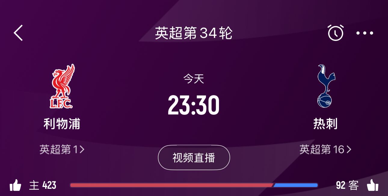 23:30 英超第34轮 利物浦vs热刺