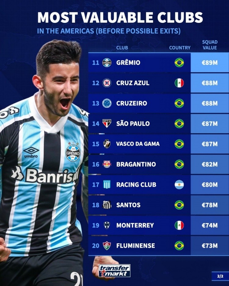 7月23日讯 德国转会市场统计了美洲俱乐部的球员总身价,并列出榜单,帕尔梅拉斯2.03亿欧居首,弗拉门戈次席。