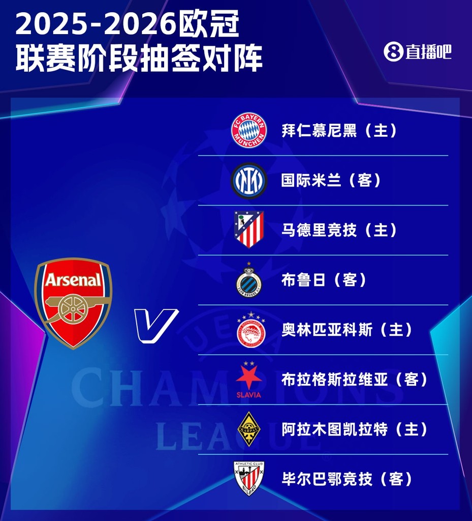 08月30日讯 欧足联官方公布欧冠联赛阶段赛程,阿森纳赛程如下。