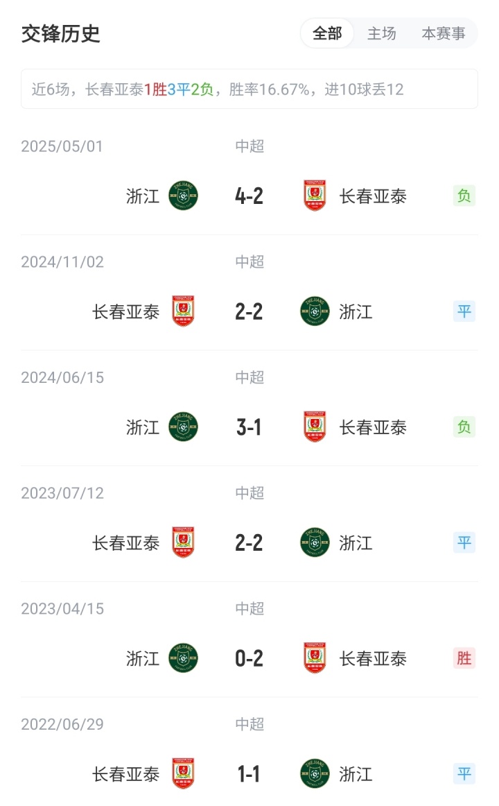 目前中超积分榜上,长春亚泰4胜4平16负积16分,暂列倒数第一;浙江10胜7平7负积37分,位列第6。
